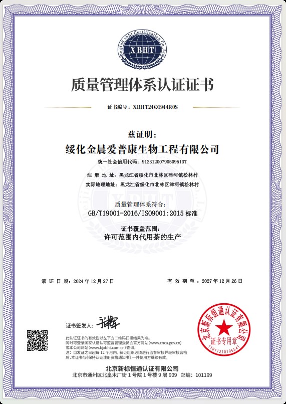 綏化金晨愛普康生物工程有限公司已成功通過質(zhì)量管理體系認證,環(huán)境管理體系認證,職業(yè)健康管理體系認證。